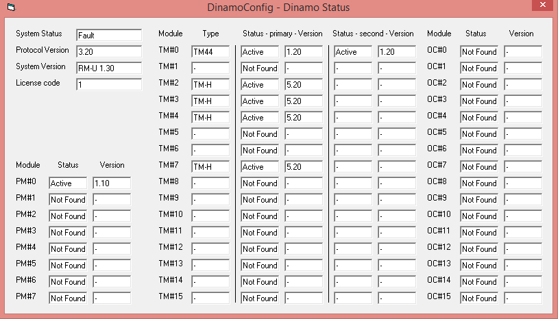 When I set both DIP 6-Switches to off-Position on both TM44_modules, than they will correctly be recognized in the DinamoConfig(s.a. the screenshot of the DinamoConfig). But if I open iTrain,the green LED on the RM-C switch on and all occupied contacts of the blocks from TM44 switch to active status (s.a.the file "Kleinstadtbahnanl_DINAMO.tcd).