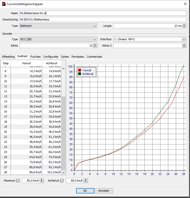 Het betreft de Fleischmann Sprinter, de Fleischmann Plan-V en de Roco 1600. Alle meer dan 30 jaar oud. Ik krijg hun maximum schaalsnelheid niet boven de 90-100 km/h. Experimenteren met verschillende waardes in de CV's 5 en 53 heeft weinig tot geen resultaat gegeven. Ook het aanpassen van de PWM van 40 naar 20 kHz geeft geen resultaat. De baanspanning staat op 16volt. Alle locs en treinstellen met een moderne motor rijden veel beter en op de juiste schaalsnelheid. Ik hoor van 2 spoorvrienden dat die hetzelfde probleem ervaren met oudere gedigitaliseerde treinen.