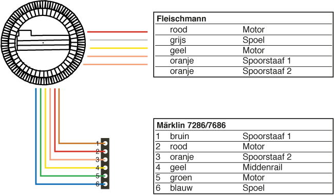 beste Leon, heb de draaischijf aangesloten volgens de tekening van de handleiding, zie in de handleiding een blokje P103, volgens mij is dat alleen voor een terugmelding, omdat mijn draden geknipt waren (dus het stekkertje eraf van de flatbandkabel draaischijf), heb ik de kleuren aangehouden die op de tekening staan, maar nu heb ik geen stroom op de brug (rails), zal er toch wat omgedraaid moeten worden qua kleuren? of moet er toch een gele draad naar stroom, er staat bij BR-punt marklin, verder bij test draait hij wel alleen mis ik een paar censoren 41 en 43 maar dat zal wel afstelling zijn van de printplaat, ik hoor graag van je, Hans