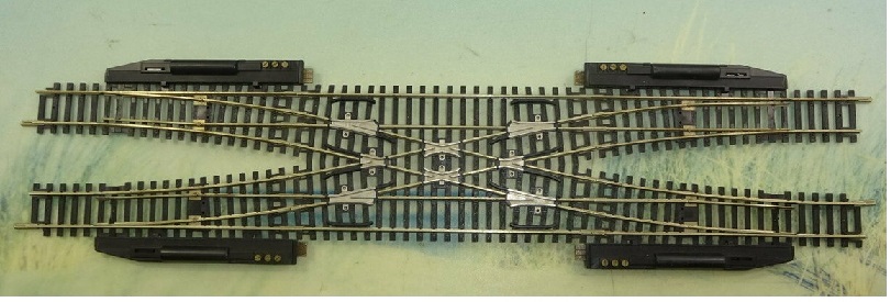 Jetzt möchte ich eine doppelte Gleisverbindung einbauen, also 4 Weichen mit einer Kreuzung in der Mitte dazwischen (in Deutschland nennt man das auch "Hosenträger").