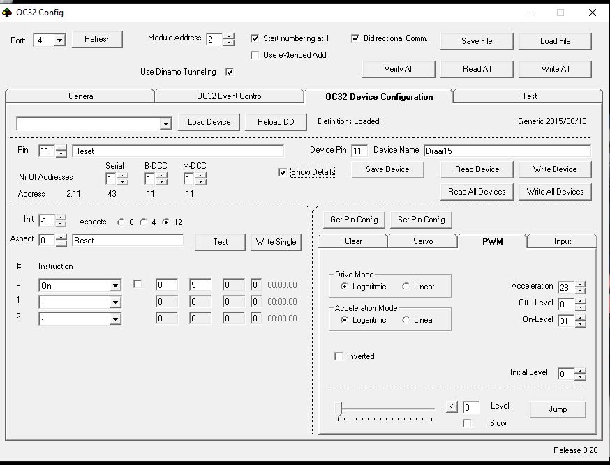 De Draai15 kaart werkt met een negatieve puls op de 7 verschillende aansluitingen en wordt aangestuurd door een OC32 met Sink drivers.