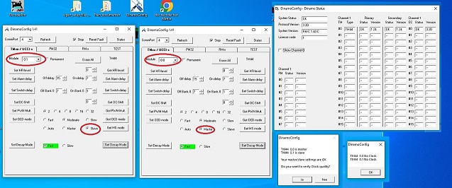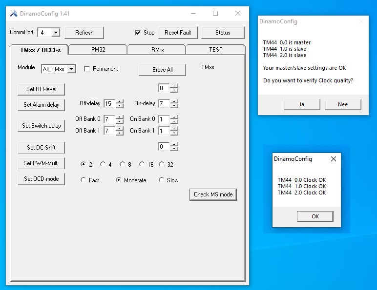 Zogezegd gedaan, mijn huidige versie was 1.21 en heb nu een 2x update gedaan naar versie 1.24. De update verliep vlekkeloos, echter toen ik via DinamoConfig (versie 1.41) ging kijken of alle modules weer in beeld waren viel mij iets op: mijn master/slave instelling was correct echter op TM 0.0 en TM 0.1 geen clock....terwijl ik niets aan de dip-switchjes heb veranderd. In eerste instantie contact gezocht met Martin maar die was ook verrast. Om uit te sluiten dat er toch iets mis was gegaan met updaten mijn beide TM44 weer terug gezet naar versie 1.21 en tada, master/slave correct EN op beide TM44 clock ok. Nog een proef op de som, beide ge-update naar versie 1.23 en ook bij deze firmware versie gaat het goed.