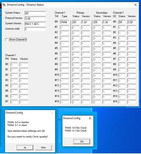 Dus resume zit er een programmeer foutje in firmware versie 1.24 die er voor zorgt dat DinamoConfig aangeeft dat er geen clock is (in mijn geval op 2 x TM44)