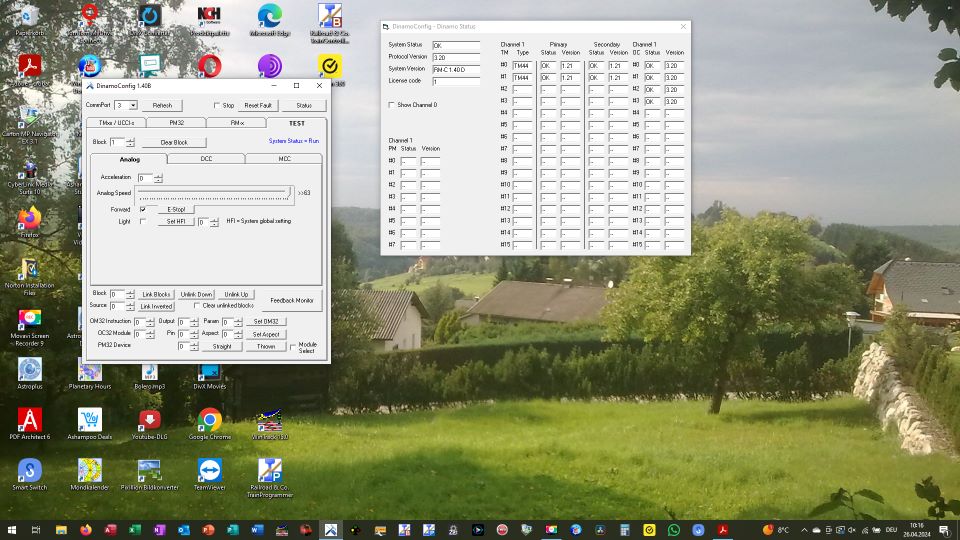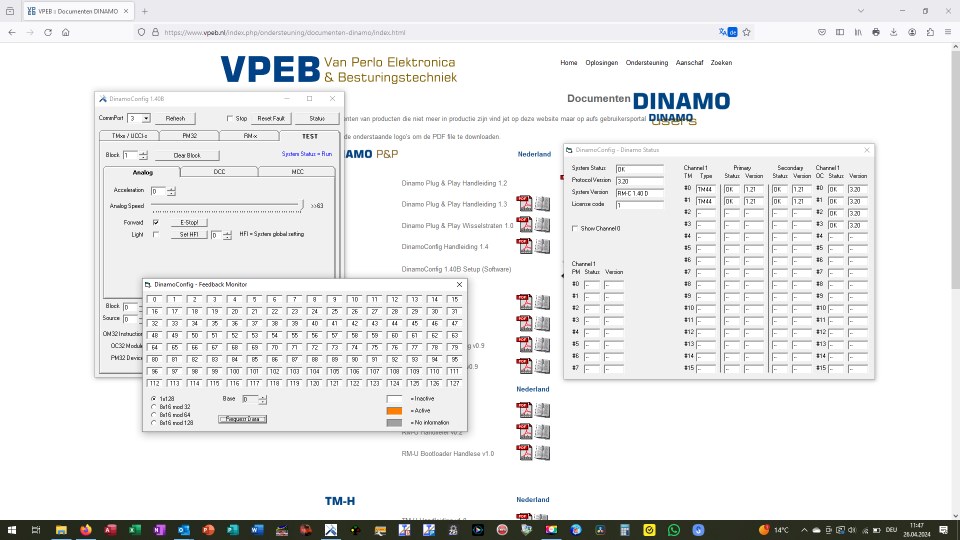 TM44 und OC32 sind angwschlossen, ebenso die Blöcke der Anlange an den TM44 verkabelt. System Status OK, (siehe Screen Shots). Einstellung RM-C1 siehe Screen shot (2. Mail). Bei der Messung mit dem Voltmeter werden 16V DC angezeigt. Wenn ich eine DC-Lok auf die Gleise stelle, fällt die Spannung auf 0V. Tests mit Dinamo-Config und ITrain bringen das selbe Ergebnis.