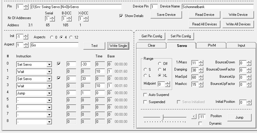 Posted by Cornelis Visser on 2025-01-10 20:31 Hoi Leon, Hierbij wat ik nu werkend heb, niet helemaal symmetrisch maar ergens is dat voor zo'n bankje ook wel natuurlijk. Aan te sturen als wissel, maar liever zou ik hem een tijdje schommelend, en dan wachtend hebben. Met Set Servo&Wait kan ik ~32 schommelingen in een 4-aspect krijgen, misschien voldoet dat al, zo'n 50 seconden actie. Met 12 aspecten natuurlijk meer, maar dat is al een hoop keer hetzelfde schrijven. Er zit geen "for --- to" loop in hè? Nog geëxperimenteerd met lagere demping, maar het wordt gauw een rommeltje. Mvg, Kees OC32 Schommelsturing.jpg (134.47 Kb)