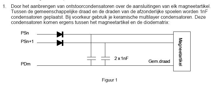 Ik zie bij de onderdelenlijst dat er 8 condensatoren 1nF - 100V, keramisch worden toegepast indien de wissels zijn voorzien van een eindafschakeling. Graag zou ik vernemen waar tussen deze condensatoren moeten worden aangesloten, op de tekening welke bij de handleiding staat is dat niet erg duidelijk. Ik wil deze schakeling namelijk zelf gaan bouwen, vandaar.