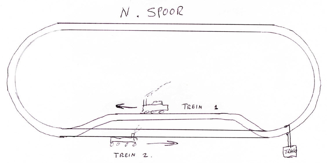 Als op de tekening trein is binnenkomt en moet automatisch stoppen en moet trein 2 gaan rijden.