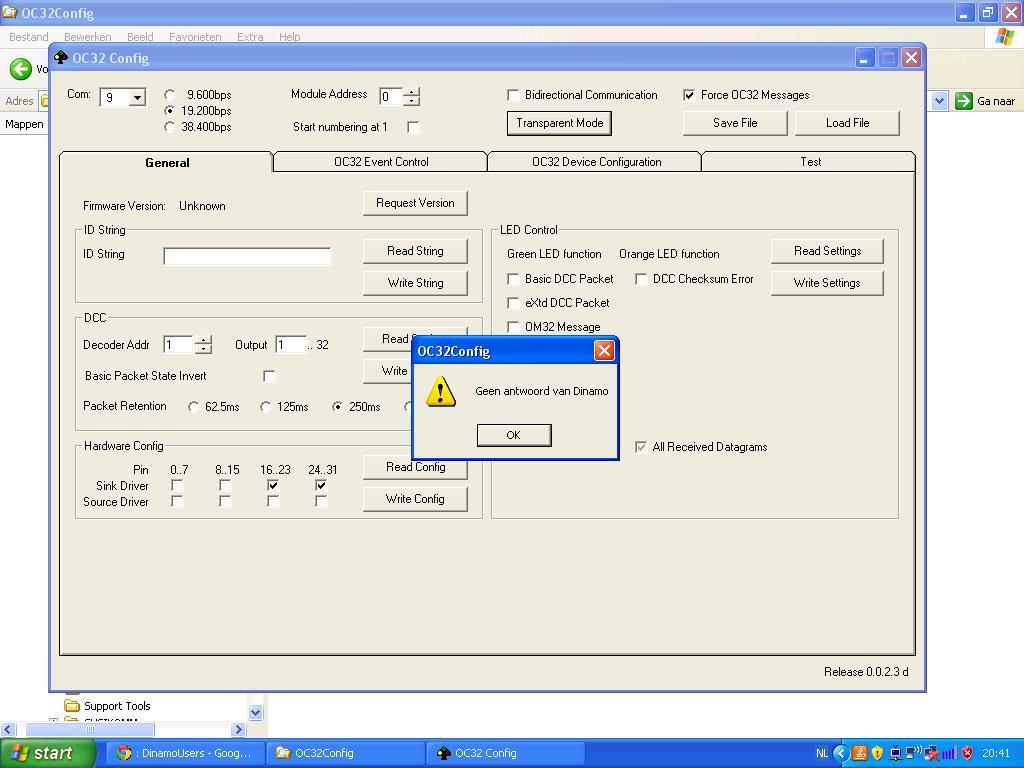 Ik heb op een schone laptop nu eerst de driver geladen en toen de OC32Config 0.0.2.3d en ook op deze laptop krijg ik de meldeng Geen antwoord van Dinamo.