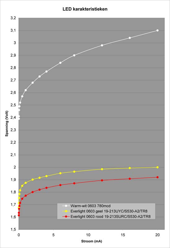 So LEDs of different colors have different characteristics. This characteristic can be measured. The following image shows an example of a red, yellow and white LED at room temperature (click for a larger version). Note: this does not mean that all LEDs have this characteristic, it may very well vary by brand and type!