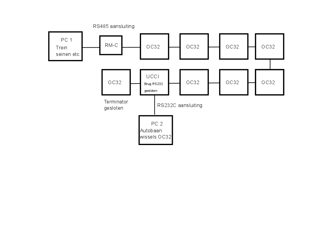Een PC is verbonden via een RM-C +1 met een groep Dinamo artikelen, 8 stuks OC32 en een UCCI.