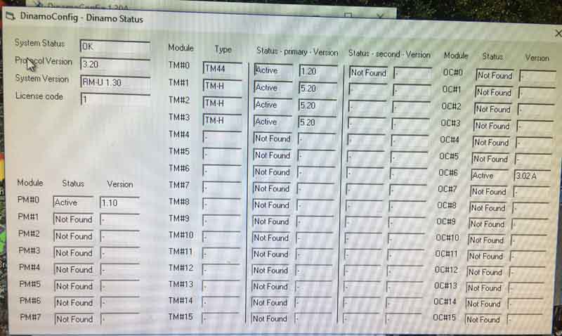Ik ben ook wel benieuwd naar de firmware versies van de diverse modules. Ik weet nog dat je een keer in Zwolle bent geweest om alles te updaten, maar ook dat is alweer een poosje geleden. Stuur eens een screenshot van het status venster in DinamoConfig.