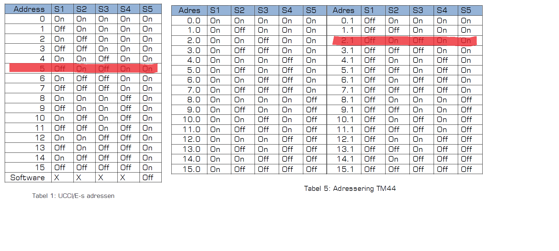 Als ik nu uit ga bij de UCCI/E van adres 5 valt mij op dat deze o.b.v. dipswitches hetzelfde adres zou hebben als mijn TM44 met adres 2.1.
