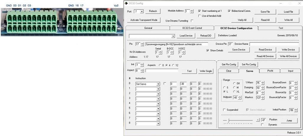 Ik ben nu bezig met de oc32 ahob schakeling. De lampen heb ik werkend gekregen alleen de servo's krijg ik niet aan de praat. Ik heb de servo's aangesloten via de SP04A. De uitleg die bij het bestand van de ahob zit is voor mij niet helemaal duidelijk, misschien kan iemand mij hier bij helpen. Ik heb alles aangesloten via onderstaande info, maar wat bedoelen ze met: Alle besturingscommando's zitten gekoppeld aan Pin 0? Pin 0 = Spoorwegovergang N+0 Knipperlicht 1 = een van de lampen op de paal Pin 1 = Spoorwegovergang N+1 Knipperlicht 2 = de andere lamp op de paal De lampen op de palen aan tegenoverliggende zijde staan gewoon parallel Pin 2 = De binnenste lamp op de boom Pin 3 = De middelste lamp op de boom Het toplicht op de boom wordt aangesloten via een diodebrug (zie schema) De lampen op de bomen aan tegenoverliggende zijde staan gewoon parallel Pin 16 = Servo van de boom aan achterzijde Pin 17 = servo van de boom aan voorzijde Alle besturingscommando's zitten gekoppeld aan Pin 0 Openen: Set Servo +16 open de achterste boom. Zit de servo op een andere pin dan +16, gebruik dan de juiste offset In dit voorbeeld is -58 de stand behorende bij "open". Pas deze waarde aan zoals de eigen situatie vereist Let op dat je ook de initiele stand van de servo hieraan gelijk maakt Set Servo +17 open de voorste boom. Zit de servo op een andere pin dan +17, gebruik dan de juiste offset In dit voorbeeld is -56 de stand behorende bij "open". Pas deze waarde aan zoals de eigen situatie vereist Let op dat je ook de initiele stand van de servo hieraan gelijk maakt Wait: Wacht 12,8 seconden. Dat is ongeveer de tijd die de bomen nodig hebben om open te gaan + een paar seconden. Pas indien nodig de tijd aan naar behoefte Multibit 4: Zet alle lichten uit. Merk op dat Pin 4 juist aan is, maar dit is omdat deze pin geinverteerd wordt aangestuurd Sluiten: Blink alt: Laat de lichten op de palen om en om knipperen Clone (2x) Laat de lampen op de bomen synchroon meeknipperen Wait: Wacht 4 seconden. Pas indien nodig de tijd aan naar behoefte. Set Servo +16: sluit de achterste boom. Zit de servo op een andere pin dan +16, gebruik dan de juiste offset In dit voorbeeld is 40 de stand behorende bij "dicht". Pas deze waarde aan zoals de eigen situatie vereist Set servo +17: sluit de voorste boom. Zit de servo op een andere pin dan +17, gebruik dan de juiste offset In dit voorbeeld is 46 de stand behorende bij "open". Pas deze waarde aan zoals de eigen situatie vereist. Als ik dan in de oc32config op test klik gaan alleen de lampen knipperen maar de servo's doen niets. Groetjes Mark