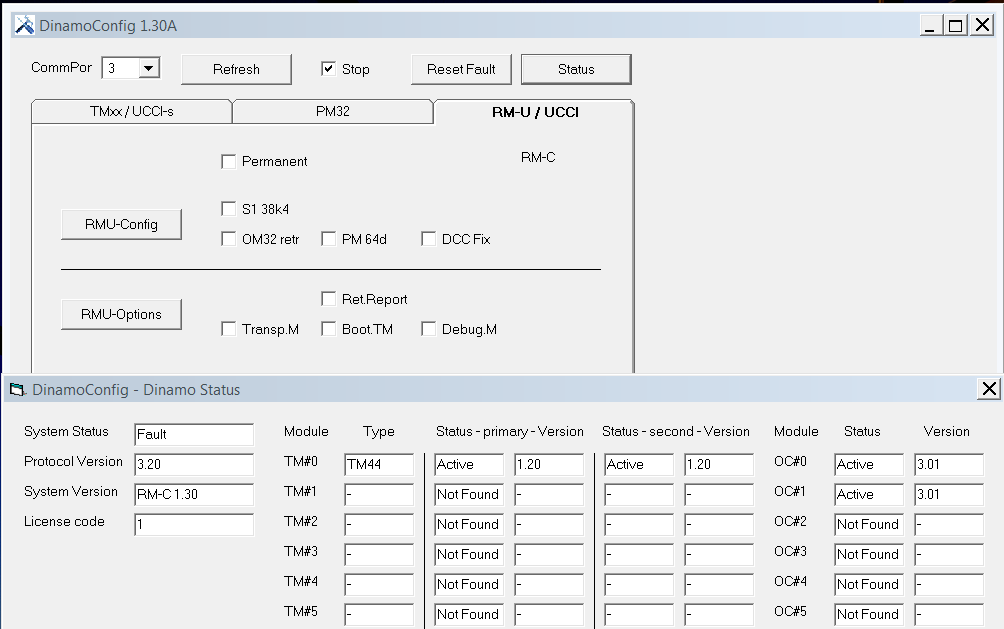 When I set both DIP 6-Switches to off-Position on both TM44_modules, than they will correctly be recognized in the DinamoConfig(s.a. the screenshot of the DinamoConfig). But if I open iTrain,the green LED on the RM-C switch on and all occupied contacts of the blocks from TM44 switch to active status (s.a.the file "Kleinstadtbahnanl_DINAMO.tcd).
