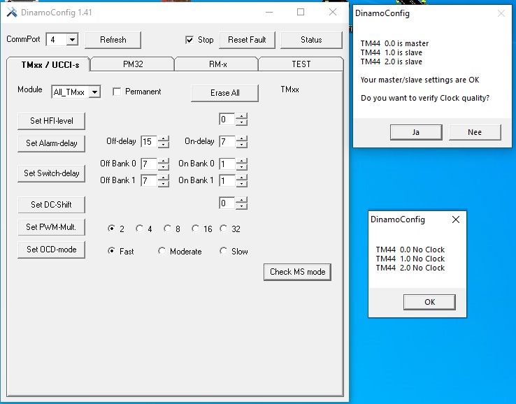 Dus resume zit er een programmeer foutje in firmware versie 1.24 die er voor zorgt dat DinamoConfig aangeeft dat er geen clock is (in mijn geval op 2 x TM44)
