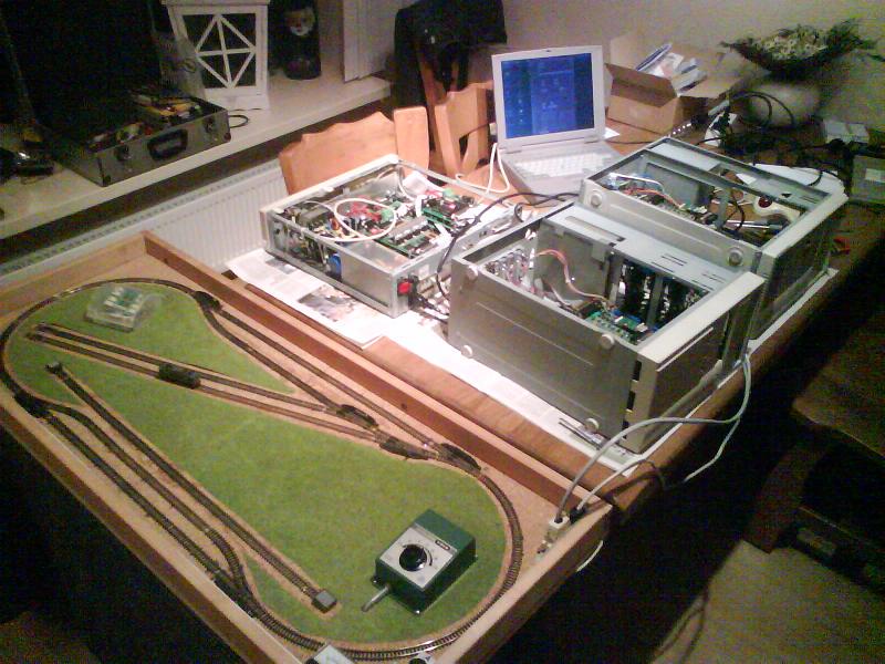 Alle problemen zijn opgelost. De 7 blokkaarten verdeeld over 3 kasten communiceren nu normaal met correcte bezetmeldingen. Ook het proefrijden op alle blokkaarten mbv mijn testbaantje verliepen goed.