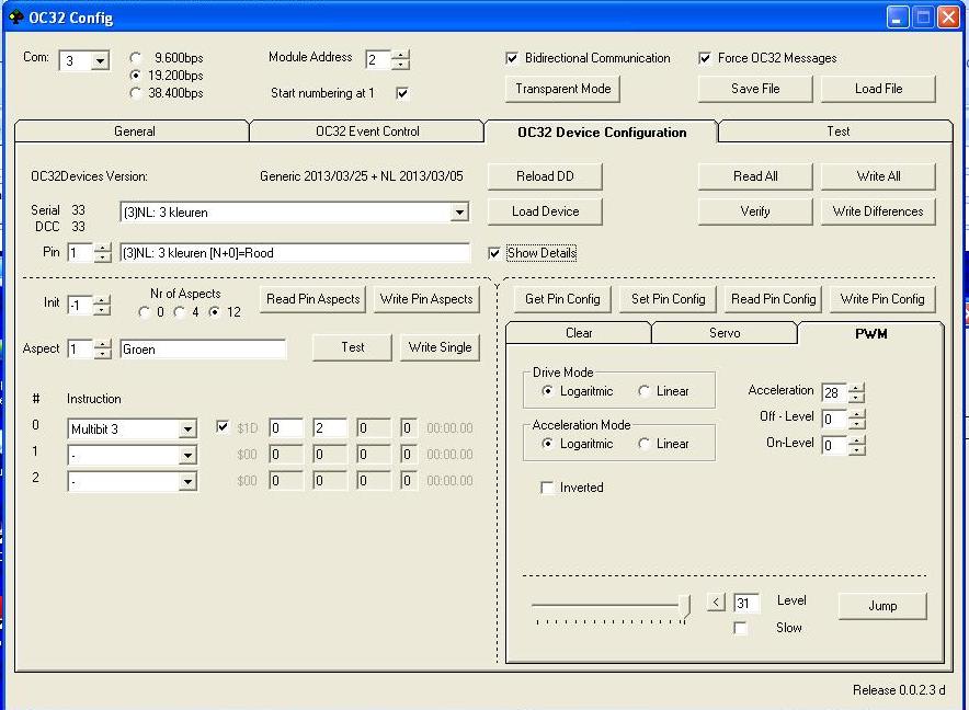 als ik daar een NL sein op aansluit, dan werkt het rode en het gele licht, maar de middelste pin (=groen) werkt niet. ik heb de draden al verwisseld om te kijken of het lampje niet toevallig kapot is. ook heb ik geprobeerd met de instellingen van een Duits inrijsein, maar dat gaf dezelfde klacht. ook op verschillende pinnen uitgeprobeerd, maar steeds hetzelfde resultaat. de middelste pin doet niet mee. als ik bij de aspect1 (=groen) het getal achter multibit3 verander van 2 naar 4, dan gaat het gele lampje branden. waar zit mijn denkfout?