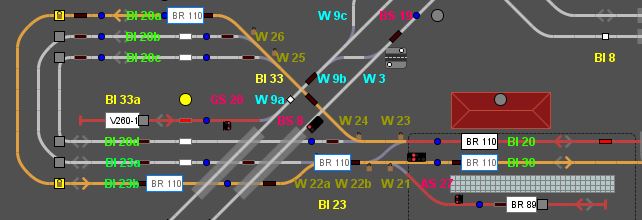 Die bevorzugte Fahrrichtung läuft über Bl 20 zu den Blöcken 20a, 20b, 20c und von dort zu den korrespondierenden BLöcken 20d, 23a, 23b zum Bl 30 oder alternativ zum Bl 20. Das Blockpaar 20a und 23b ist als freie Strecke definiert und nicht als Bhf sondern als Durchfahrtsgleis.