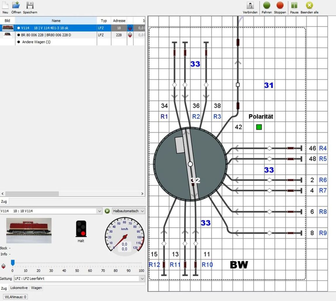 ich habe seit kurzen eine Drehscheibensteuerung DTC 100 Version 1/DTS mit 1 x DTR für 16 Anschlußgleise und 2x DDS. Benutzt werden die Anschlüsse 2,4,6,8,11,13,15,34,36,38,46,48 der Drehscheibe. Die Steuerung funktioniert manuell ohne Probleme mit DTCConfig 3.17.