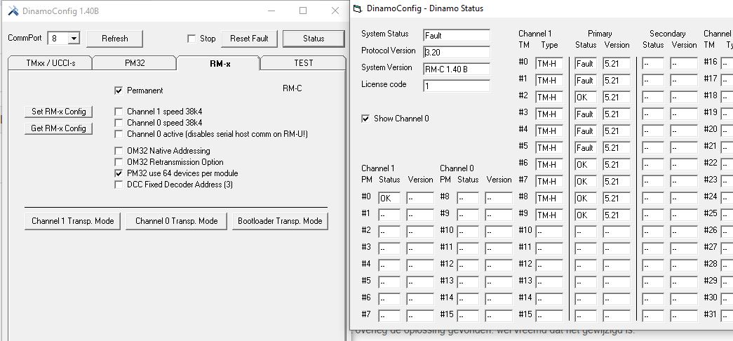PM32 functioneert 50% Posted by Onno on 2021-05-09 12:13 Mijn LGB treinbaan gebruikt een PM32 voor de aansturing van de wissels. Met een DMD van PiComIT zijn de MDdec met DMA via een UTP kabel aangesloten. Van de PM32 werken de poorten 1 t/m 4 prima maar 5 t/m 8 werken niet (meer). Wat kan hiervan de oorzaak zijn?