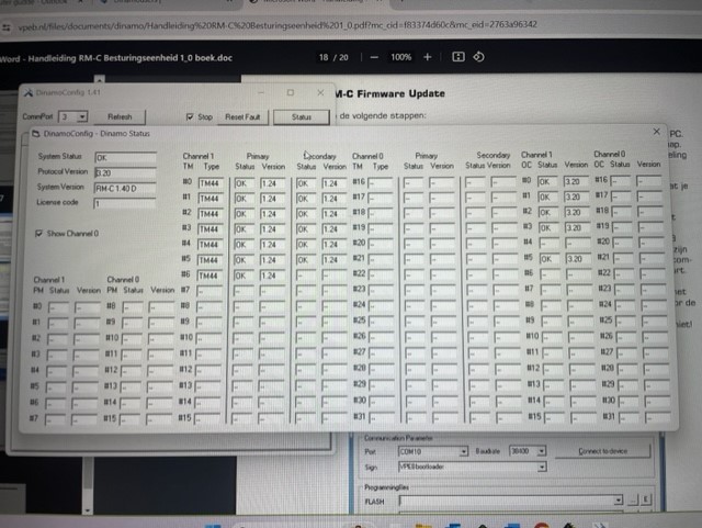 Ik heb een tijd geleden al mijn TM44's al een update gegeven naar 1.24. En alles liep erg mooi. Afgelopen week na het lezen van de nieuwsbrief van DTS, begreep ik dat DinamoConfig ook een update nodig heeft (naar versie 1.41) om de update ten volste te benutten. Nadat ik dit heb uitgevoerd, reageren al mijn treinen (digitaal en analoog) niet meer, of ze lopen heel slecht/ schokkerig. Verlichting in de treinen brandt ook vaker niet dan wel. Het is net alsof er nauwelijks "prik" op de baan staat, of dat er kortsluiting is ontstaan. Ik rij met iTrain en daarin heb ik niets veranderd. Ik krijg ook geen foutmeldingen in DinamoConfig (zie foto / alle TM's + OC's op status OK). Voor de zekerheid heb ik de RM-C ook de laatste software gegeven, maar dit mocht ook niet baten. Slow-Decay of fast-Decay maakt niets uit. OCD mode staat op moderate en het HFI level op 11. De MS modes kloppen allemaal.