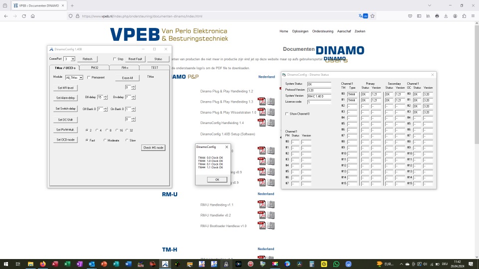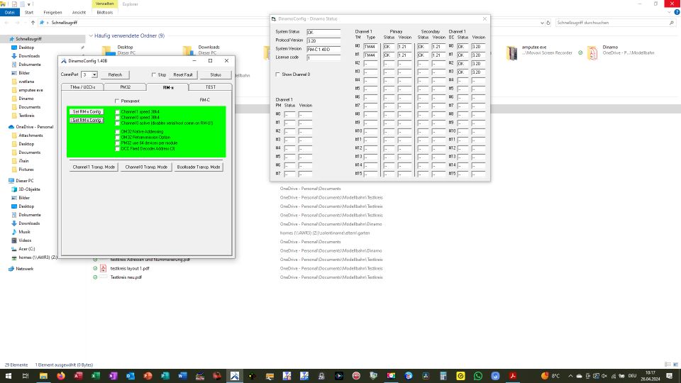 TM44 und OC32 sind angwschlossen, ebenso die Blöcke der Anlange an den TM44 verkabelt. System Status OK, (siehe Screen Shots). Einstellung RM-C1 siehe Screen shot (2. Mail). Bei der Messung mit dem Voltmeter werden 16V DC angezeigt. Wenn ich eine DC-Lok auf die Gleise stelle, fällt die Spannung auf 0V. Tests mit Dinamo-Config und ITrain bringen das selbe Ergebnis.