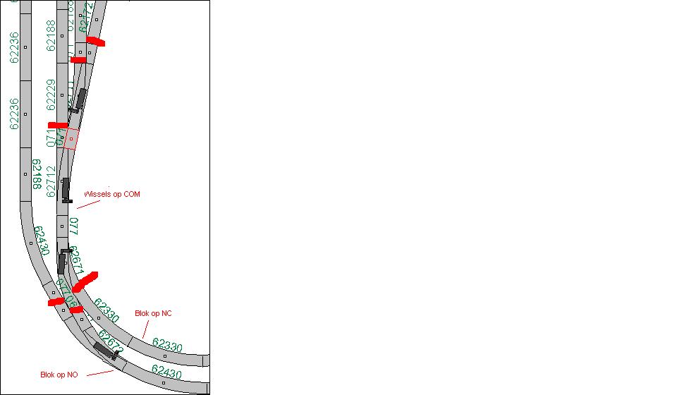 Ik heb een wisselstraat bij mijn station. Ik gebruik een DR4 relais voor het schakelen. Ik heb een plaatje bijgevoegd met de situatie. De loc rijdt prima van een van de perrons naar het blok wat NC van de DR4 zit aangesloten maar de loc rijdt niet naar het blok wat op NO zit aangesloten.
